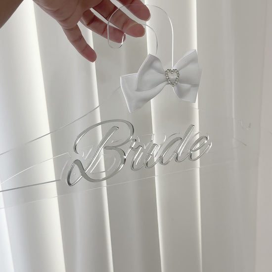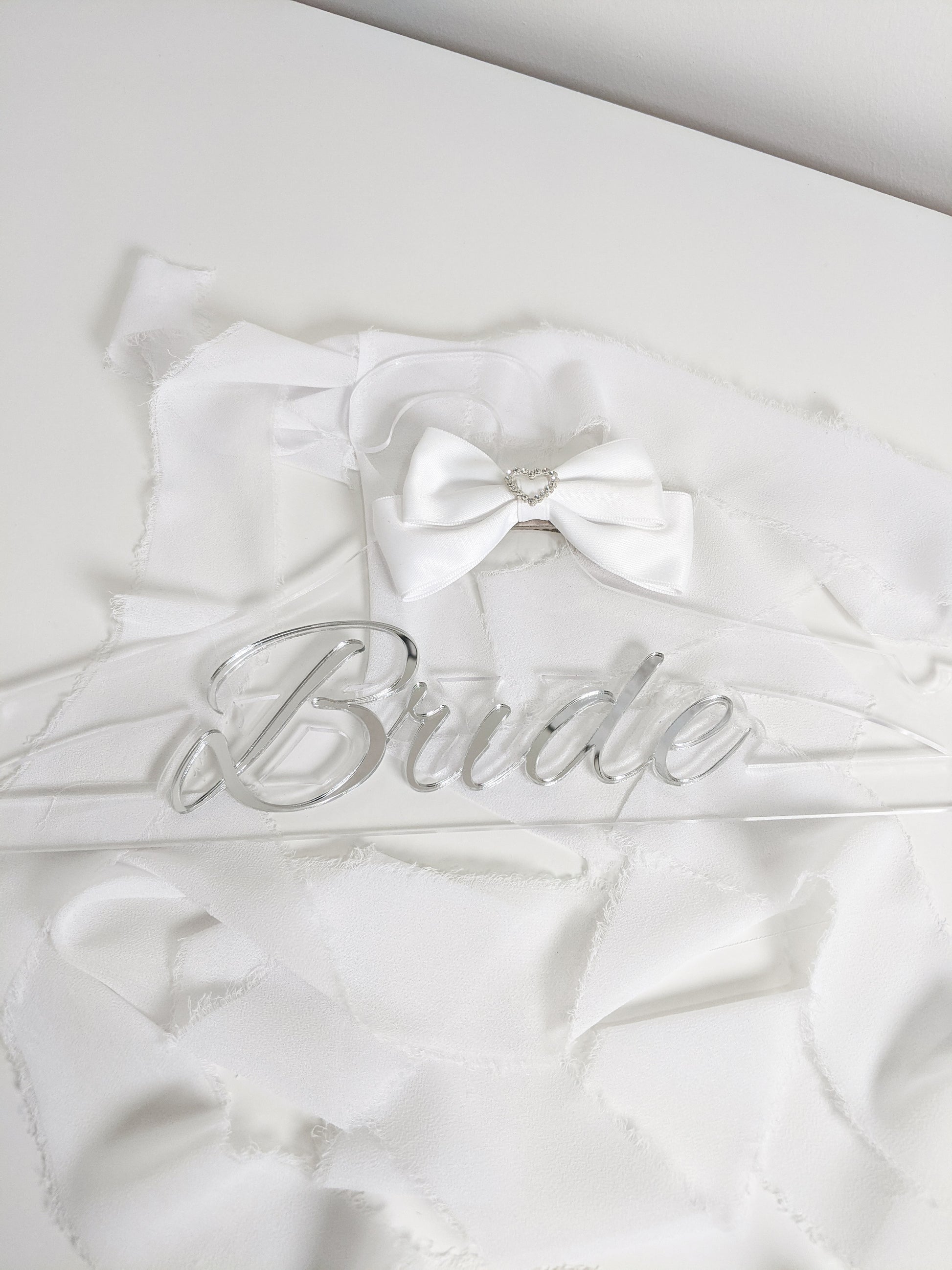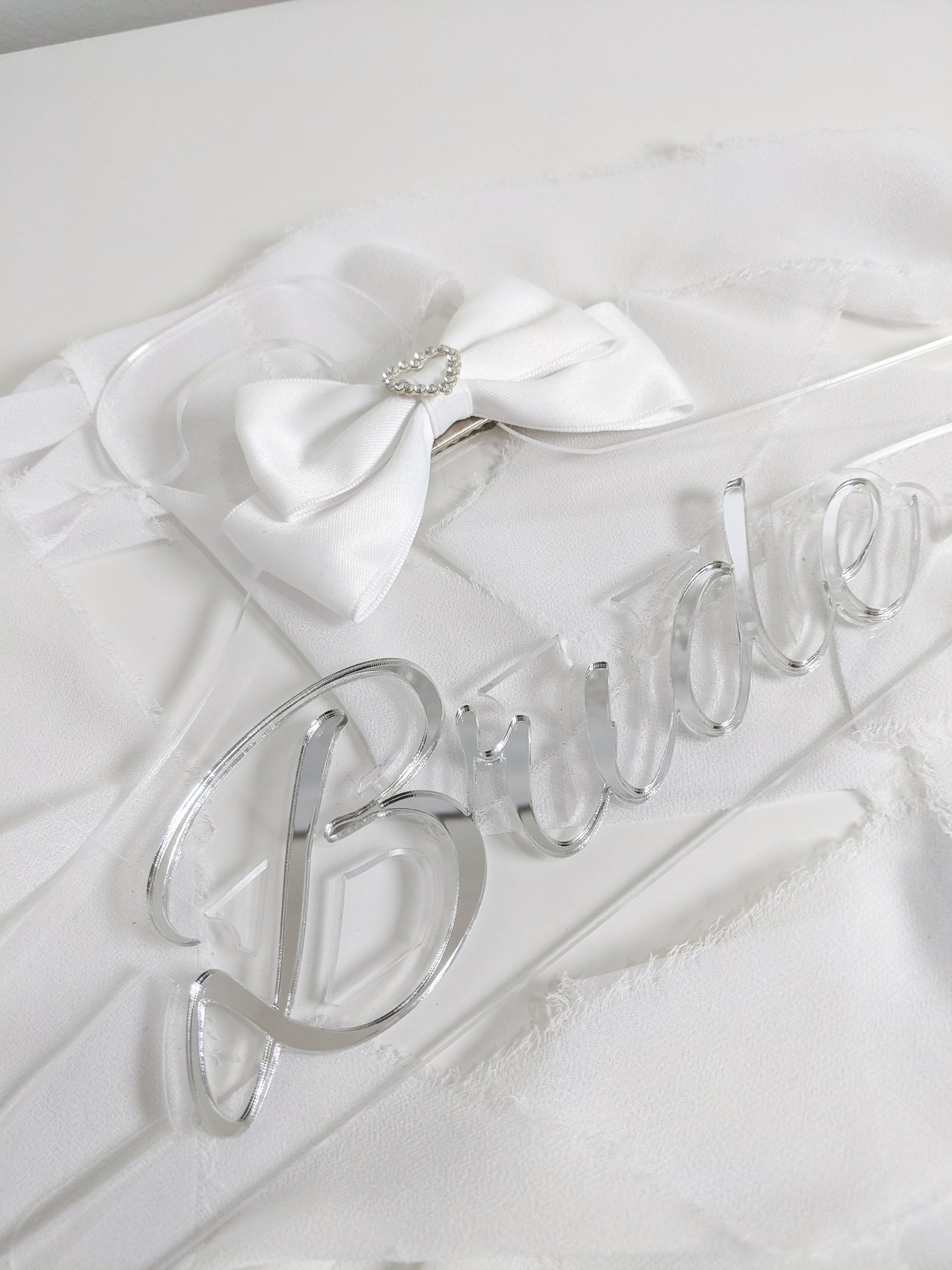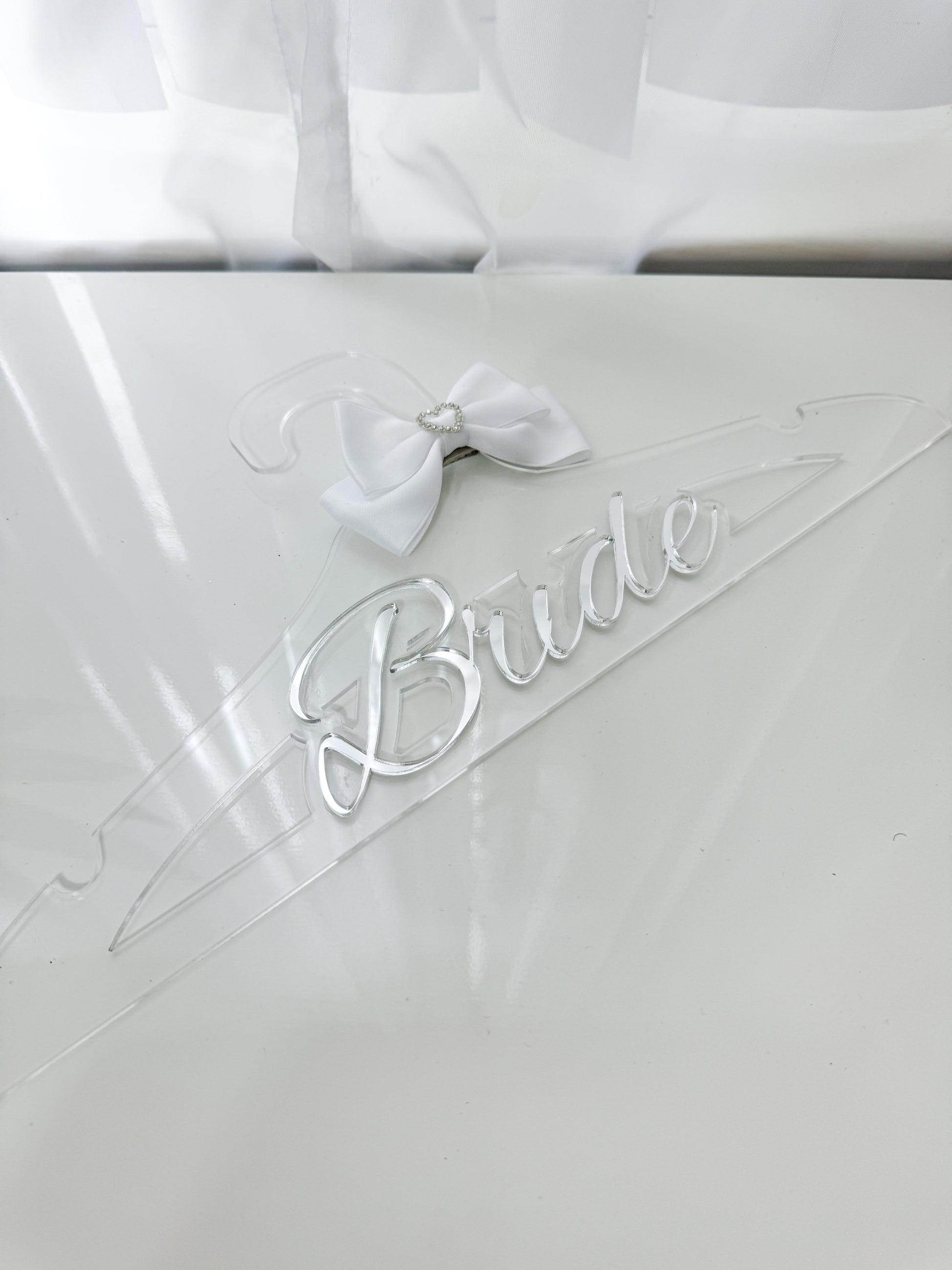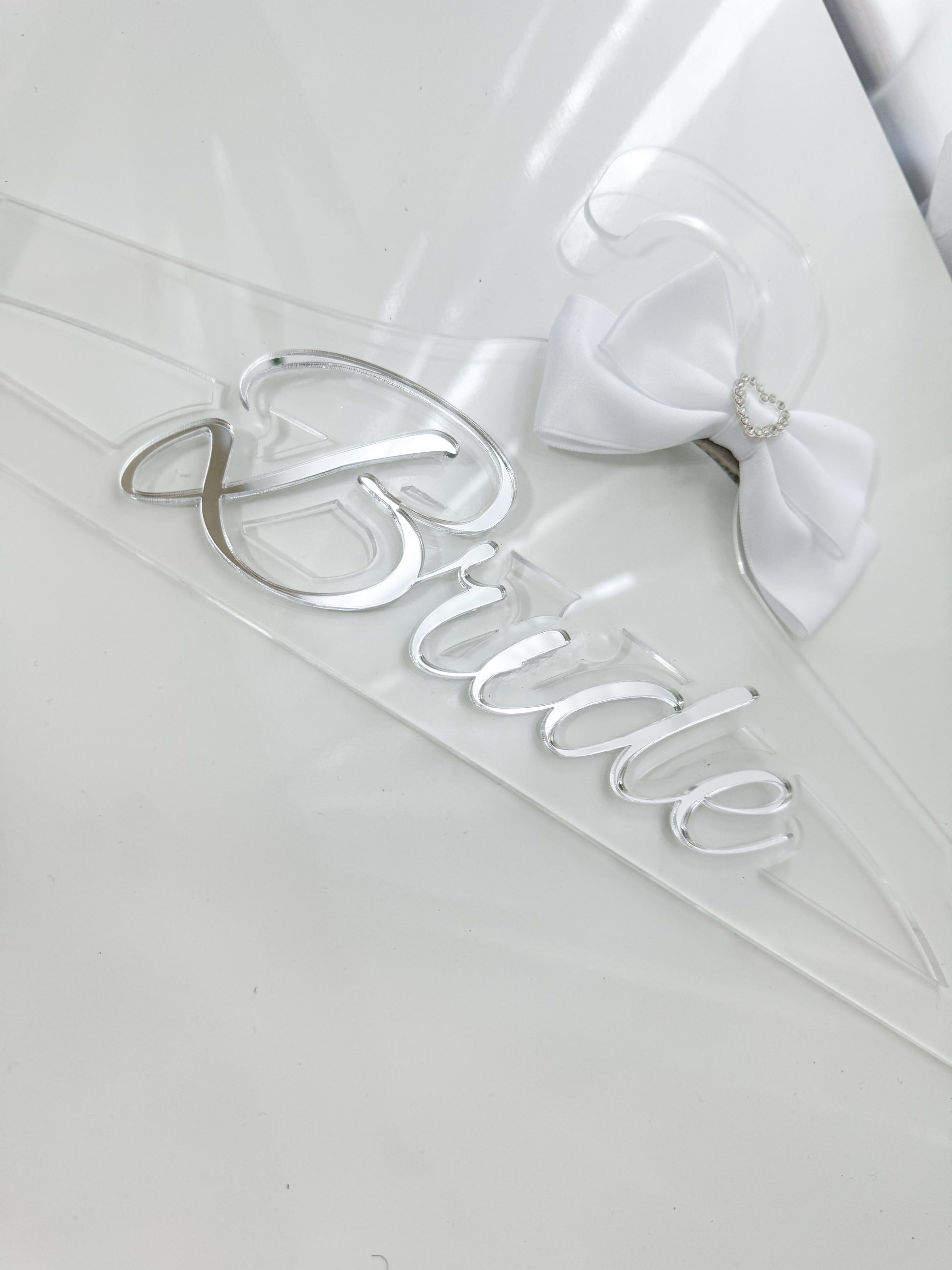 Custom Bride Acrylic Hanger with White Bow, Personalized Wedding Dress Hanger