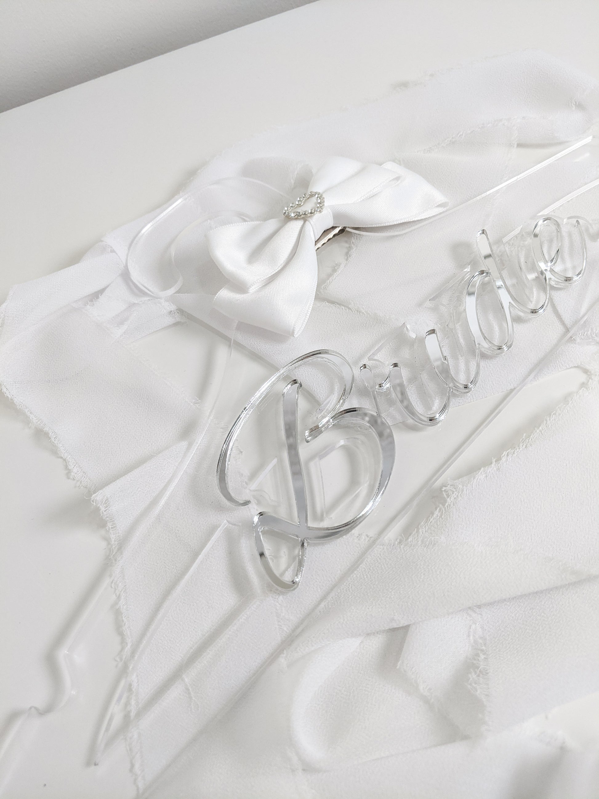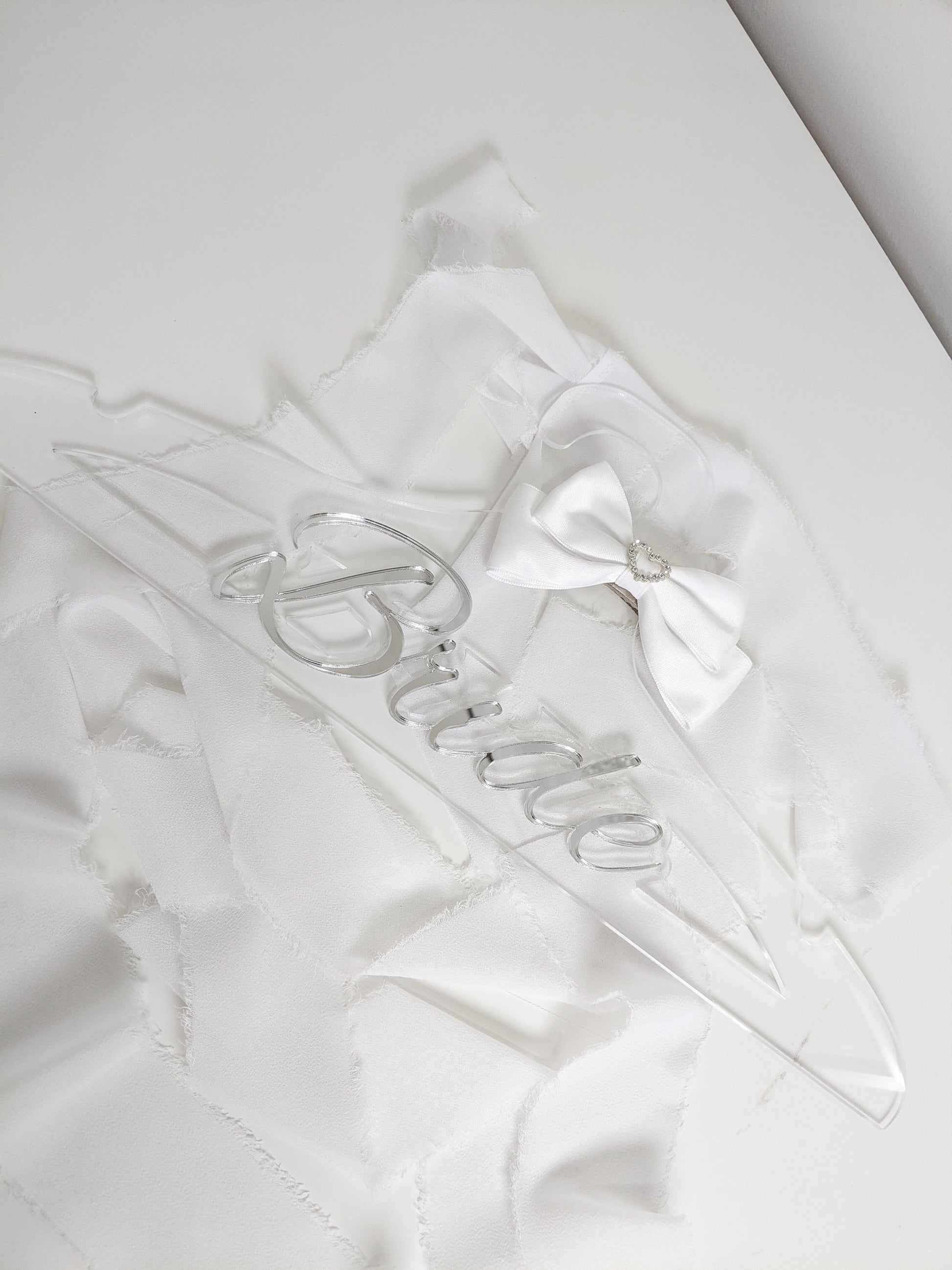 Make your wedding day even more special with our elegant Custom Bride Acrylic Hanger, designed to beautifully display your gown before you say “I do.” Featuring a graceful white satin bow and personalized engraving, this hanger is a must-have for stunning dress photos and a timeless bridal keepsake.