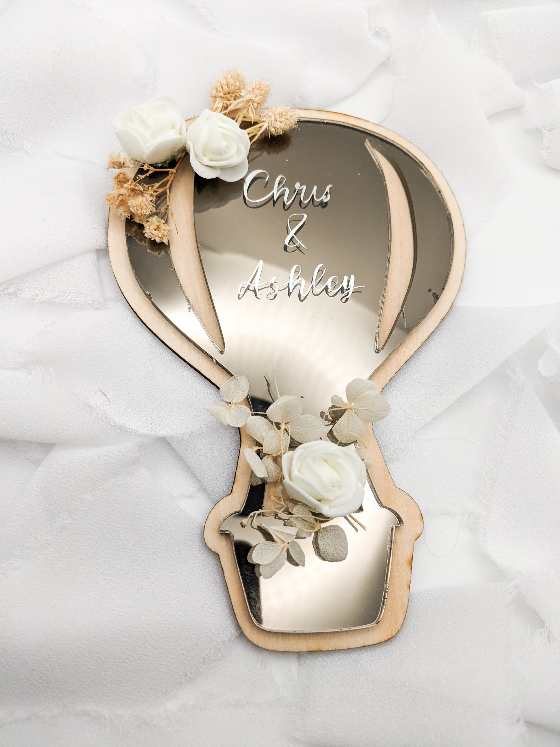 Celebrate your big day with our Custom Hot Air Balloon Wedding Sign, a whimsical and elegant keepsake that adds a magical touch to your wedding decor. Designed with a charming hot air balloon silhouette, this sign is crafted from high-quality wood and shimmering acrylic mirror, making it a standout piece for your ceremony or reception or a keepsake in your house. The size measures “16.5” wide by 11” long. Bronze mirror featured in photo.