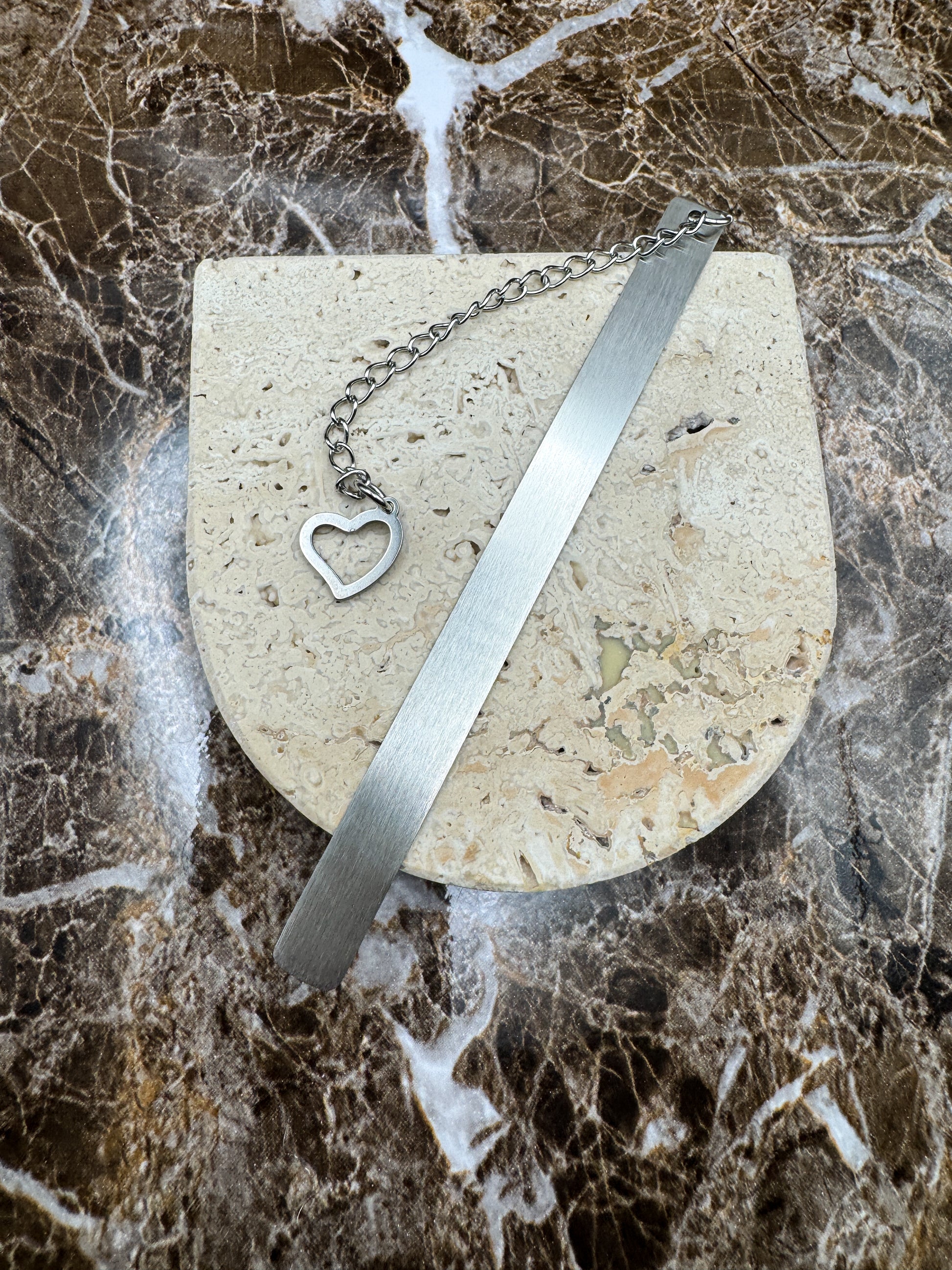 Crafted from durable stainless steel with a polished silver finish, this elegant bookmark measures 5” long by 0.4” wide, making it the perfect size for novels, journals, planners, and textbooks.